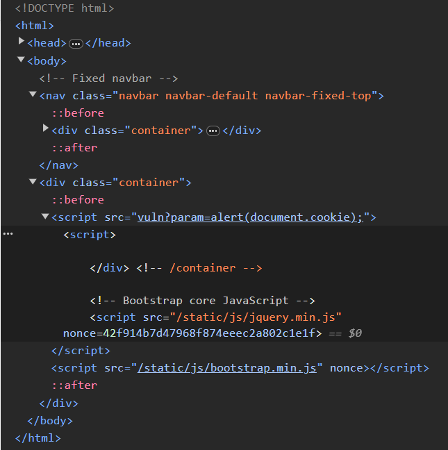 response.headers['Content-Security-Policy'] = f"default-src 'self'; img-src https://dreamhack.io; style-src 'self' 'unsafe-inline'; script-src 'self' 'nonce-{nonce}'; object-src 'none'"