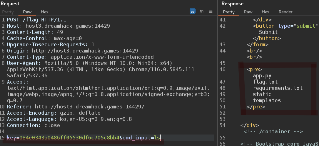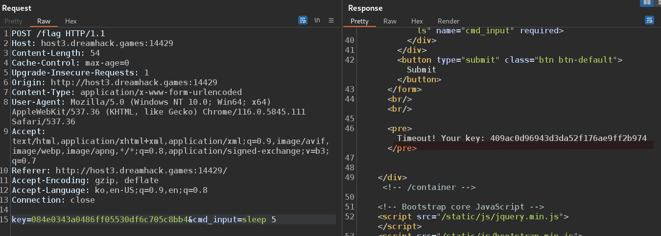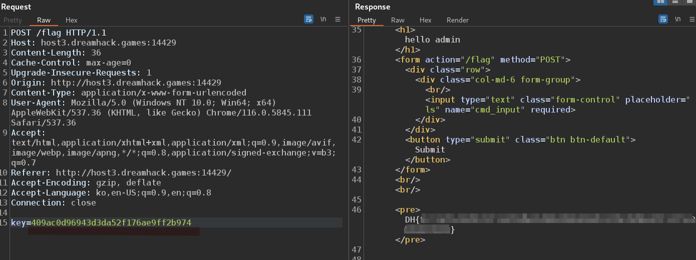 : /index ํ์ด์ง์์ /flag ํ์ด์ง๋ก ๋์ด๊ฐ ๋, ์ ๋ฌํ๋ ๊ฐ์ด key ๋ฟ์ด์์ง BurpSuite ๋๊ตฌ๋ฅผ ํ์ฉํ์ฌ ํจํท์ ๊ฐ๋ก์ฑ์ cmd_input๋ ์ ๋ฌํ ์ ์๊ฒ ์์ฑํ์๋ค.