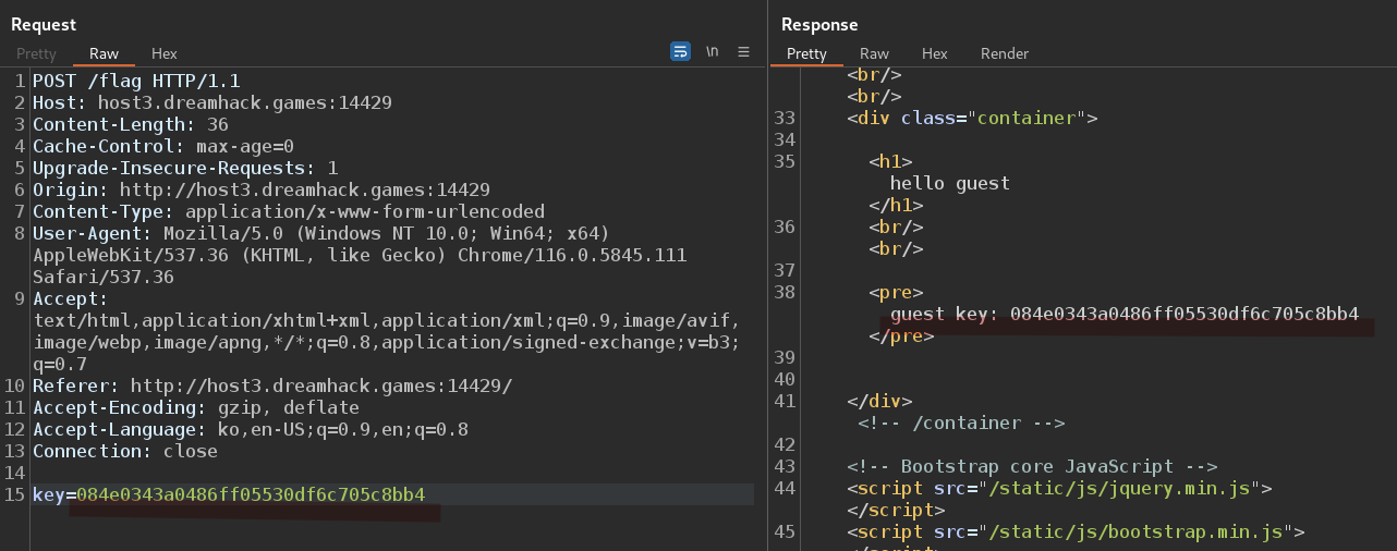 : app.py์์ guest_key๊ฐ 'hashlib.md5(b"guest").hexdigest()'๋ค์๊ณผ ๊ฐ์ด ๋์ํจ์ ํ์ธํ๊ธฐ ๋๋ฌธ์ md5 ๋ณตํธํ ํด์ guest์ key ๊ฐ์ ํ์ธํ ์ ์๋ค.