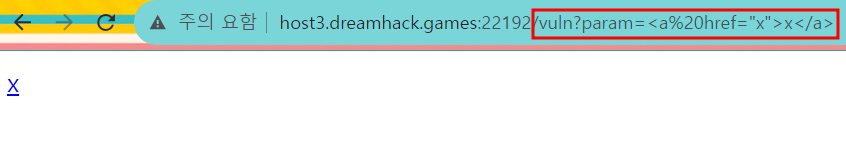 : '/vuln' ํ์ด์ง์์ ์ฌ์ฉ์๊ฐ ์ ๋ ฅํ param๊ฐ์ด ํ๋ฉด์ ์ถ๋ ฅ๋๋ ๊ฒ์ ํ์ธํ ์ ์๋ค.