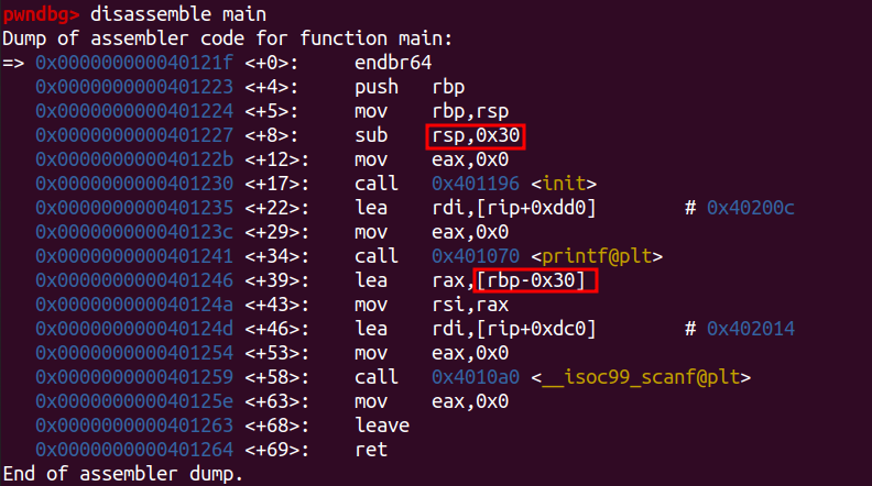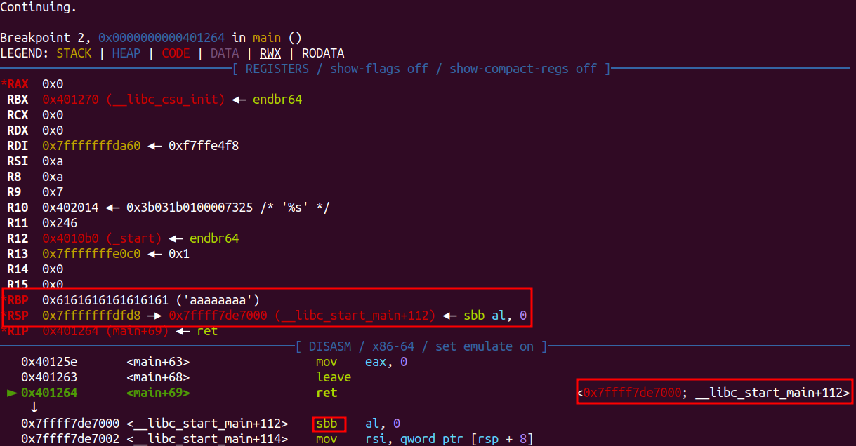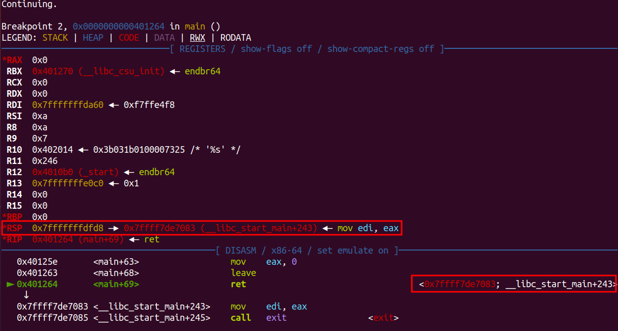 pwndbg> b *main+69 #๋๋ฒ์งธ ์ค๋จ์