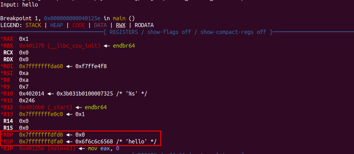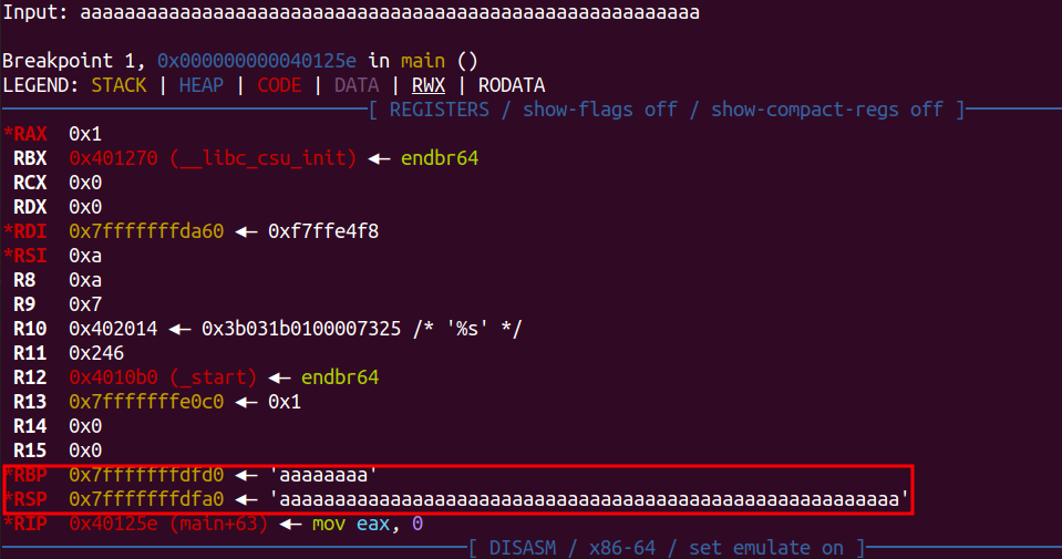 pwndbg> b *main+63 #์ฒซ๋ฒ์งธ ์ค๋จ์