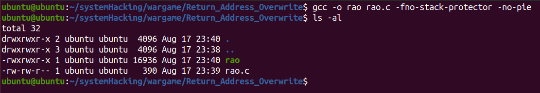 : rao.c ํ์ผ์ ์ปดํ์ผ ํ ์ด๋ฆ(rao)์ผ๋ก ์ง์ ํด์ค ํ -no-pie ์ต์ ์ ์ด์ฉํ์ฌ PIE(Position Independent Executables)๋ฅผ ๋นํ์ฑํ๋ก ์ผํ์ผ ํ๋ก๊ทธ๋จ์ ์์ฑํ๋ค.