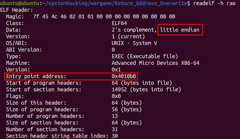 : ์ปดํ์ผ์ ๊ดํ ์ ๋ณด๋ฅผ ํ์ธํ๊ธฐ ์ํด์ readelf -h์ฌ์ฉํ๋ค.