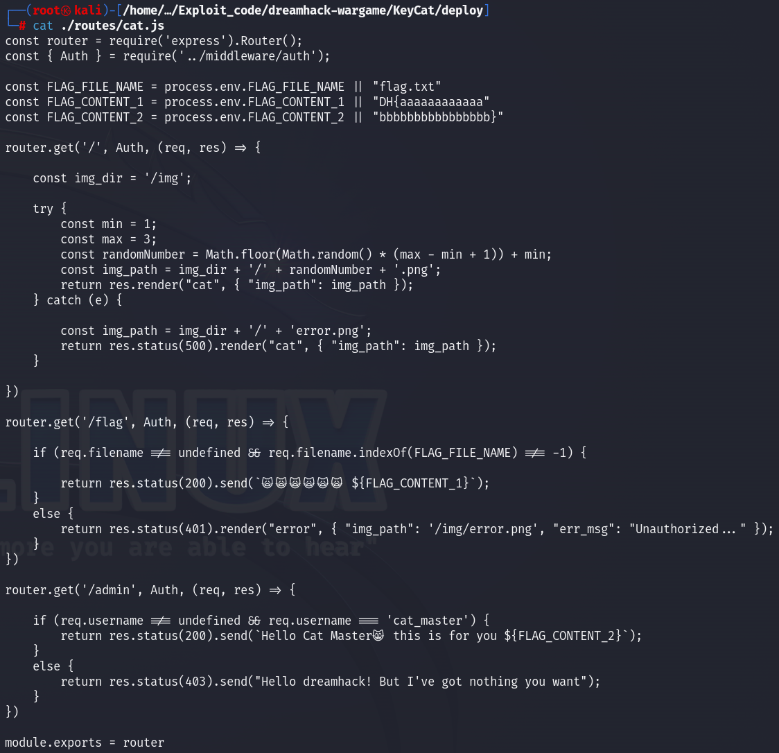 : /cat/flag๋ req.filename์ FLAG_FILE_NAME์ ๋ด์ฉ์ด ํฌํจ๋์ด ์์ด์ผ ํ๋ค.