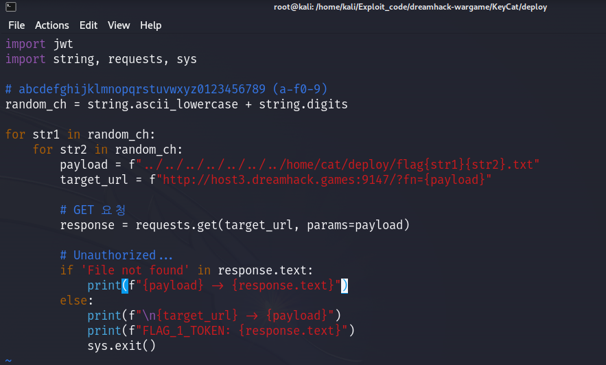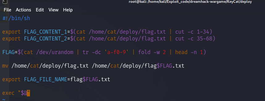: FLAG๋ /home/cat/deploy/flag$FLAG.txt๋ก ๋์ด ์๋ ๊ฒ์ ํ์ธํ ์ ์๋๋ฐ ์ด๋ ์์์ ๋ณ์์ 2๊ธ์์ ๋๋คํ a-f0-9 ๋ฌธ์์ด์ ํ ๋นํ์ฌ ํ๋๊ทธ ํ์ผ ์ด๋ฆ์ ๋ถ๋ ๊ฒ์ด๋ค.
