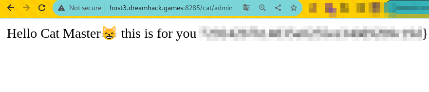 : /cat/flag์ /cat/admin ์๋ํฌ์ธํธ์ ์กฐ๊ฑด์ ๋ง์ถฐ์ ์์ฒญ์ ๋ณด๋ด๋ฉด ๊ฐ๊ฐ FLAG_CONTENT๋ฅผ ํ์ธํ ์ ์๋ค.