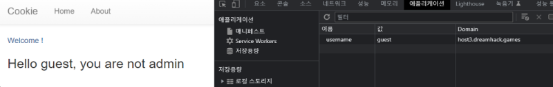 :๋ฌธ์ ์์ ์ ์ํ ๊ฒ์ฒ๋ผ admin ๊ณ์ ์ผ๋ก ๋ก๊ทธ์ธ ๋์ด์ผ ํ๋๊ทธ๋ฅผ ํ๋ํ ์ ์์ผ๋ฏ๋ก ํ์ฌ guest ์ฌ์ฉ์์ ์ฟ ํค ๊ฐ์ ํ์ธํ์๋ค.