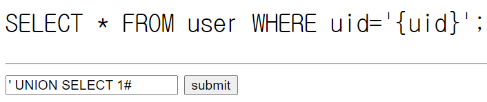 ' UNION SELECT 1,2,3# <- ๋ฐ์์ด ๋ค๋ฆ
