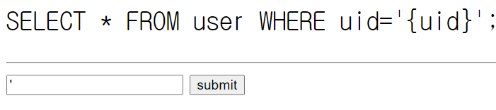<pre style="font-size:200%">SELECT * FROM user WHERE uid='{uid}';</pre><hr/>