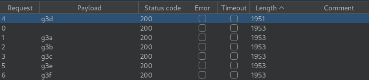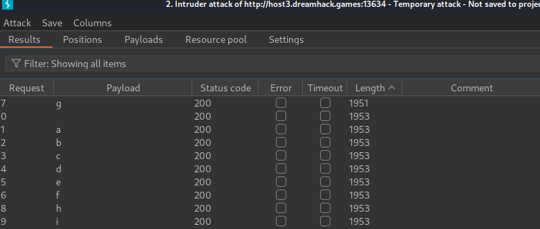 : 'g'๋ผ๋ ๊ฒ์์ ๋ค๋ฅธ ๊ฐ๊ณผ ๋ค๋ฅธ Length๋ฅผ ํ์ธํ ์ ์์๊ณ , Response ๊ฐ์ผ๋ก Good์ ํ์ธํ ์ ์๋ค.