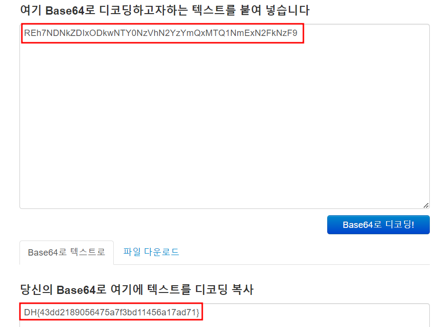: base64 ์ธ์ฝ๋ฉ ๊ฐ์ผ๋ก ๊ฒฐ๊ณผ๊ฐ ๋์จ ๊ฒ์ ๋์ฝ๋ฉํ๋ฉด ๋ค์๊ณผ ๊ฐ์ด FLAG๋ฅผ ํ๋ํ ์ ์๋ค.